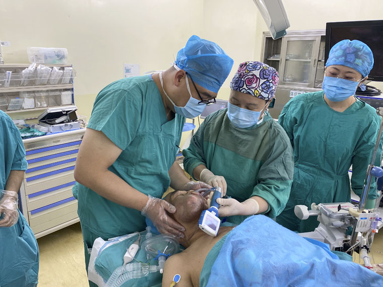 术前,贾慧群教授、李超主任带领全科讨论插管及麻醉方案,认为患者存在声门上严重困难气道,如行常规全麻诱导后插管风险极大,可能因无法建立人工气道而随时引发灾难性后果,最终决定采用轻度镇静、充分镇痛、并保留自主呼吸的气管插管方案,患者及家属表示理解和配合。