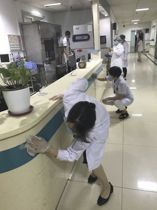 28日下午3点,东院200多名党员积极加入到大扫除活动中。大家清扫地面垃圾,清理墙上不规范的张贴物、标识,擦洗门窗、桌椅、楼梯护栏,修剪花草树木,到处可以看到热火朝天的忙碌身影。劳动之余,大家还不时向患者特别是患者家属开展禁烟宣教,讲解吸烟危害,劝导早日戒烟。各党支部书记、科室主任、护士长与其他党员一起,不怕脏,不怕累,干得认真而投入。由于天气炎热,大家汗流浃背,许多人口罩、帽子、衣服都被汗水浸透了。但是,当看到清理出大量垃圾,环境卫生得到净化、美化之后,大家都觉得自己的付出还是很值得的!