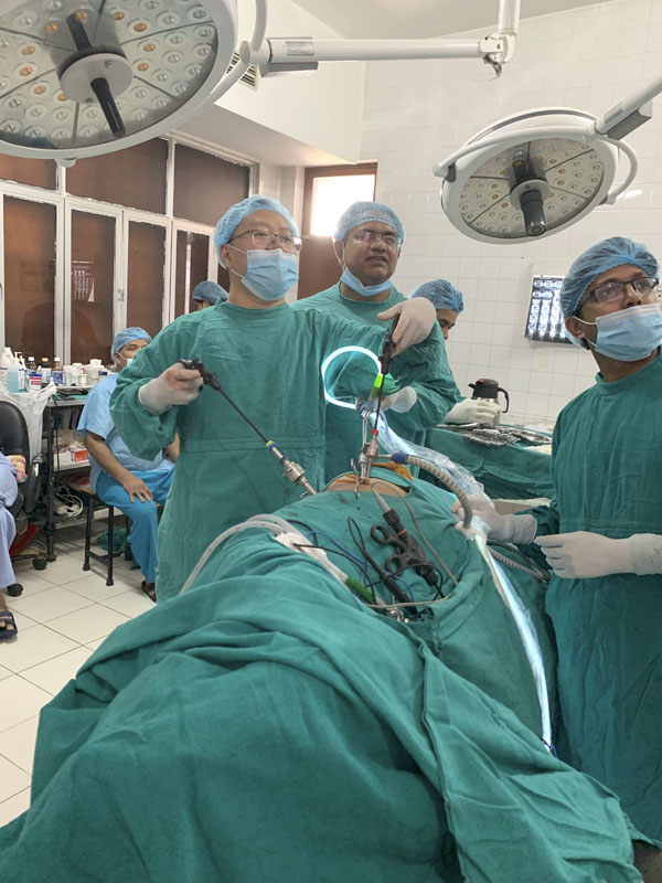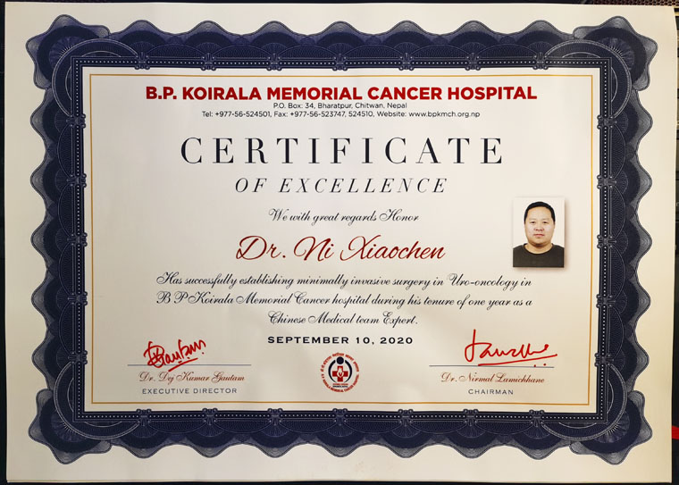 20193月,倪晓辰副主任代表我院参加第12批中国援尼泊尔医疗队,抵达万里之遥的尼泊尔B.P柯依拉腊纪念肿瘤医院执行援外任务。受援医院位于尼泊尔中部奇达旺地区,经济落后、交通不便、生活条件差,虽然该院是尼泊尔最大和最有影响力的肿瘤医院,但受限于国情且医疗水平与国内有很大差距。倪晓辰与尼尔曼院长(兼泌尿外科主任)积极深入交流,克服多种困难,竭尽所能地先后开展了腹腔镜肾部分切除术、腹腔镜膀胱根治性切除术、腹腔镜前列腺癌根治术等多种高难度手术术式,填补了该院空白,并对该院医生进行规范化手术培训,培养了一支带不走的医疗队。