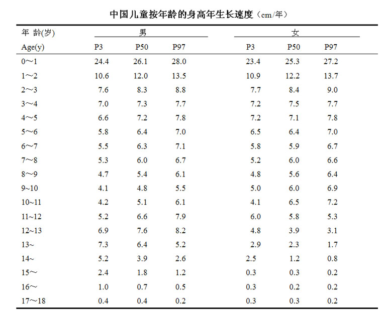 单纯以身高的绝对值来定义患者矮身材,可能导致部分患者丧失治疗时机。在矮身材出现前,要及时发现生长的异常趋势,则需要在生长发育的过程中注意监测儿童的年生长速率。婴幼儿期(3岁以下)生长速率<7厘米/年;儿童期(3岁~青春期)生长速率<5厘米/年;青春期生长速率<5.5~6.5厘米/年,可考虑为生长发育迟缓。