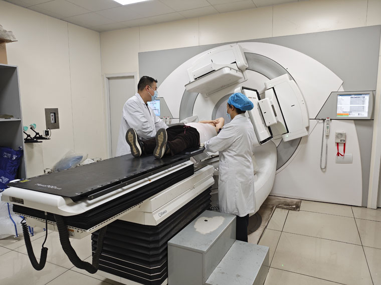 螺旋断层放射治疗加速器平稳运转,圆满完成多例疑难复杂病例的精准治疗。治疗前,团队严格通过CT扫描开展三维体位验证,确保实际体位与治疗计划精准匹配;治疗中,规范操作、精准摆位,在保障治疗精度的同时,充分兼顾患者舒适度,各项诊疗任务均高质量完成。