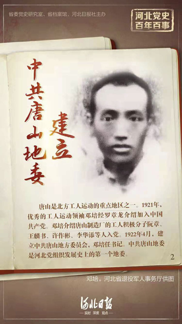 唐山是北方工人运动的重点地区之一。1921年,优秀的工人运动领袖邓培经罗章龙介绍加入中国共产党。根据中共北京地委发展党员、建立党组织的指示,邓培介绍唐山制造厂的工人积极分子阮章、王麟书、许作彬、李华添等人入党。19224月,建立中共唐山地方委员会,邓培任书记。8月,改建为中共唐山地方执行委员会(简称唐山地委)。