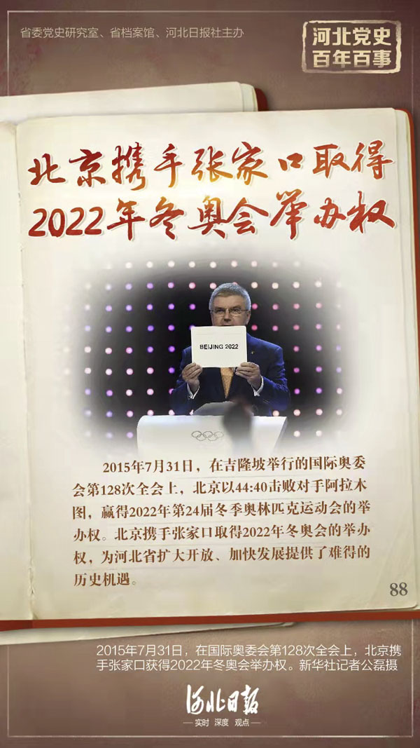 2013年11月3日,中国奥委会正式致函国际奥委会,提名北京市、河北省张家口市联合申办2022年冬奥会。2015年7月31日,在吉隆坡举行的国际奥委会第128次全会上,北京以44∶40击败对手阿拉木图,赢得2022年第24届冬季奥林匹克运动会的举办权。北京携手张家口取得2022年冬奥会的举办权,为河北省扩大开放、加快发展提供了难得的历史机遇,是继京津冀协同发展重大国家战略实施后,河北迎来的又一个重大发展机遇,对于推动经济社会发展,全方位融入京津冀协同发展战略格局具有十分重要的意义。