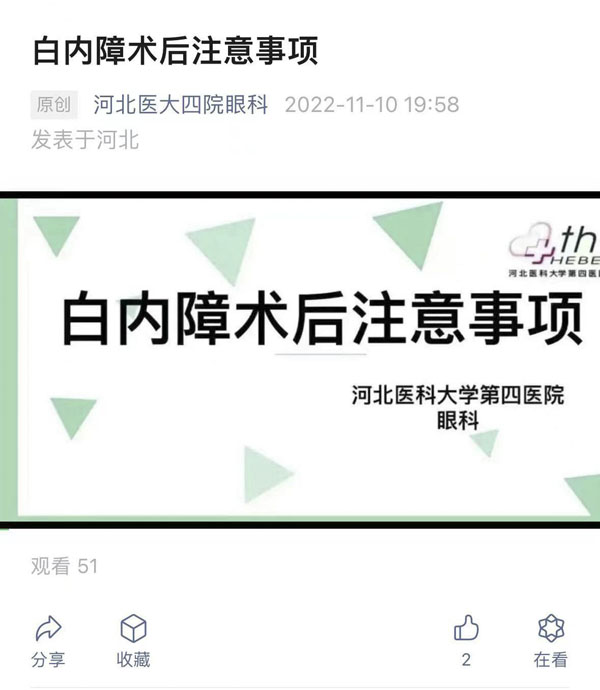 此外,团队制作了正确滴眼药水、预防跌倒、糖尿病视网膜病变、白内障、散瞳、斜视、近视、黄斑变性、视网膜脱离、青光眼等一系列科普视频,书写了多篇眼科常见疾病术后宣教、出院指导等科普文章,并有相应的宣教二维码、眼科公众号及视频号。