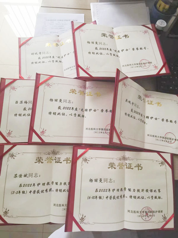 团队注重能力提升,积极参与各级竞赛。2021年5月,吕苏梅副护士长参加河北医科大学青年教师英语授课竞赛,获二等奖;2022年10月,杨丽曼、苏佳斌参加院内2022年青年教师授课竞赛,在五官科选拔赛中,分别获得中流砥柱组和青春活力组第一名;2023年9月,吴晓宇和张晓翠获河北省护理学会组织的外科护理科普竞赛优秀奖;10月,杨丽曼和白金莎在河北省护理学会组织的眼科护理科普竞赛演讲中获二等奖。此外,吕苏梅参与河北医科大学本科《老年护理学》和《护理研究》课程教学,胡晓青参与河北医科大学本科眼科临床带教学。